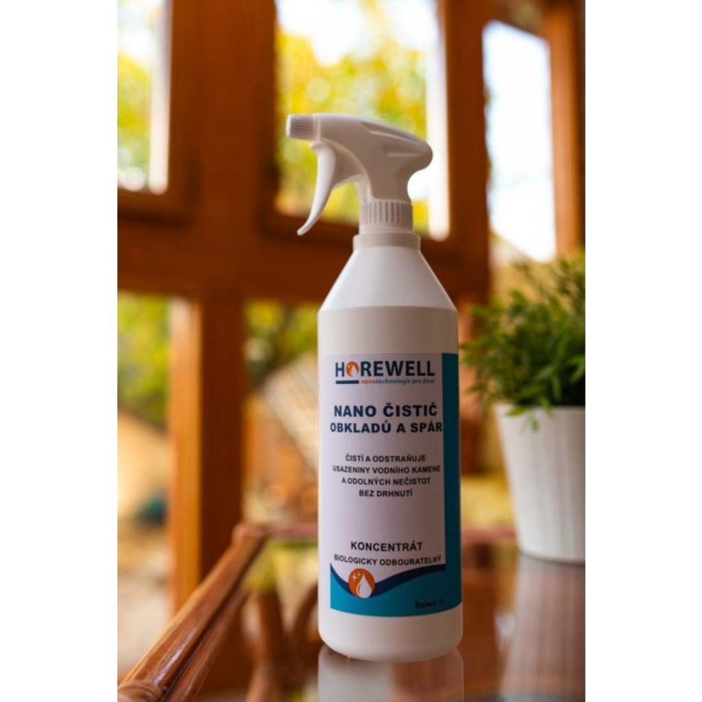 Přípravek Horewell Nano čistič obkladů a spár je na rozdíl od žíravých prostředků k povrchu šetrný, nepoškozuje ani gumová těsnění. V jediném kroku velmi rychle čistí, obnovuje a renovuje podklad. Odstraňuje též biologické nečistoty, smog, ulpělé nečistoty (řasy, sinice, mech, hmyz), apod. Je vysoce účinný při všech stupních tvrdosti vody. Určen speciálně pro aquaparky, lázně, bazény, wellness, restaurace, hotely či kuchyně. Ideální na stěny, obložení, zástěny, schodiště i podlahy.