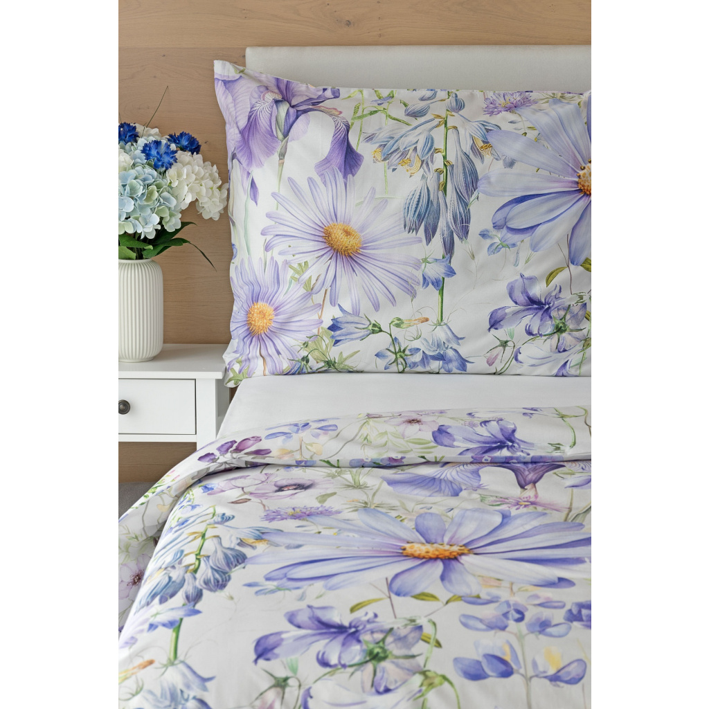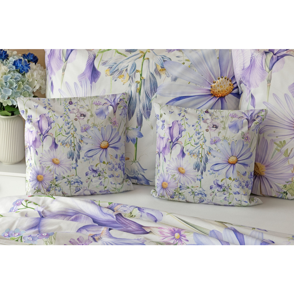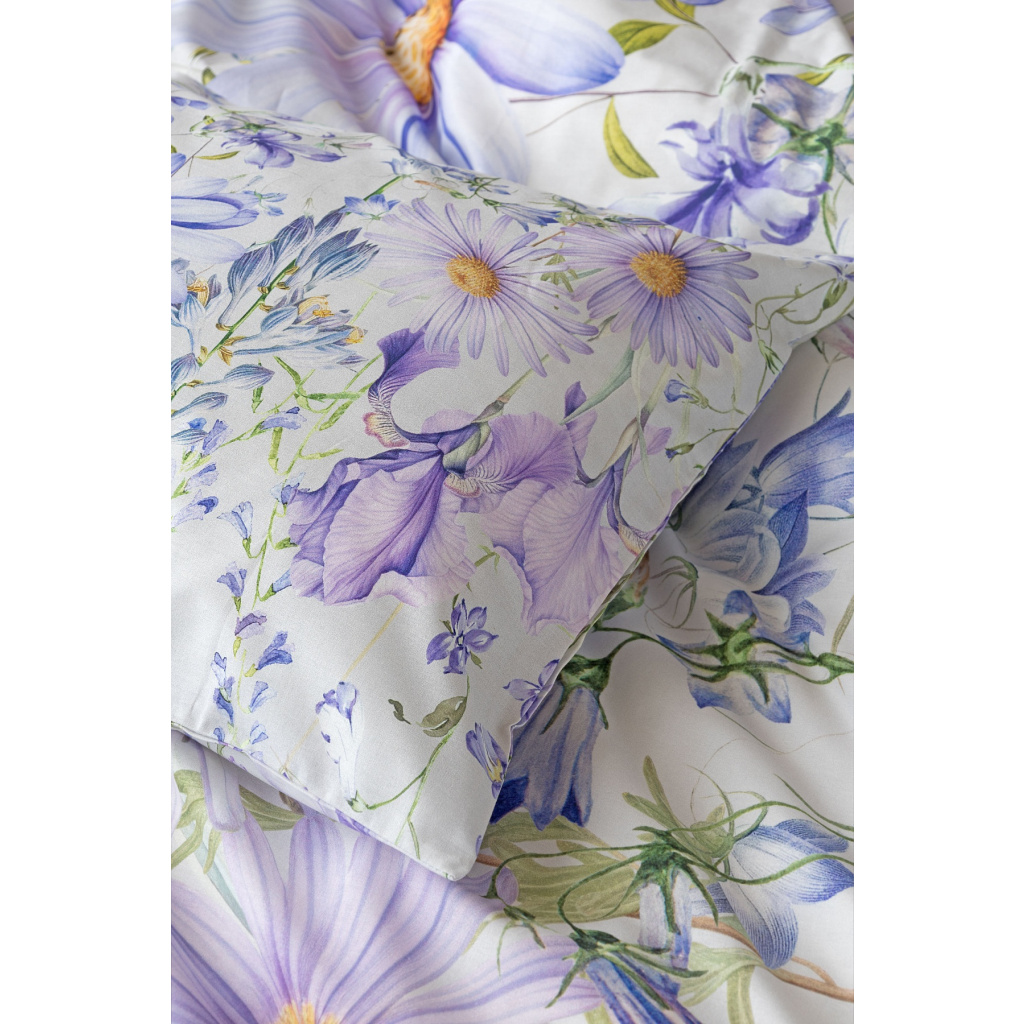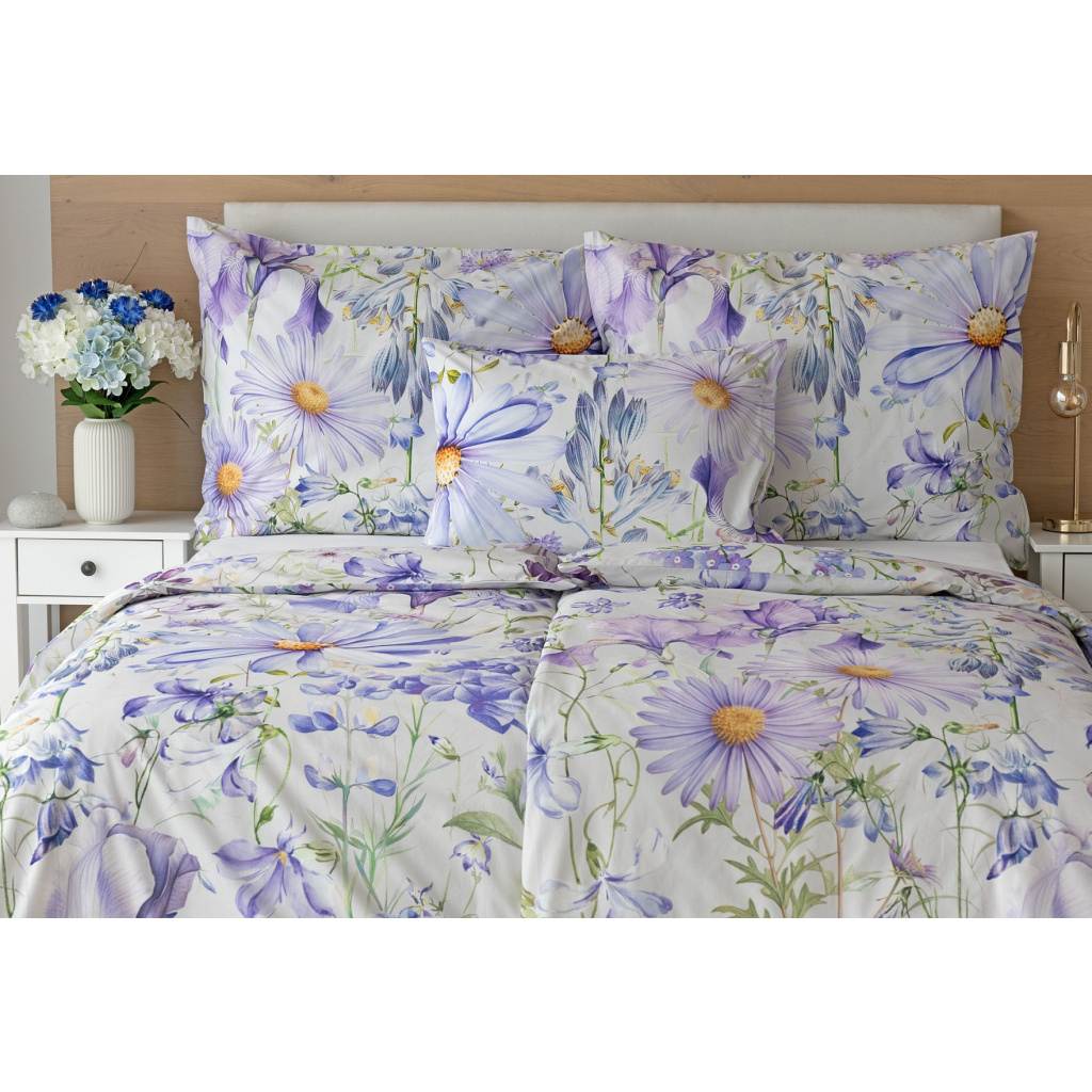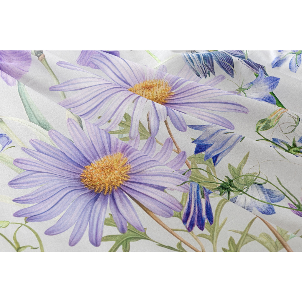 Okouzlující květinové povlečení Mirabel vnese do vaší ložnice nádech svěžesti. Květy kosatců, lučních zvonků, pomněnek i kopretin jsou v návrhu sladěny do atraktivní palety fialových a světle modrých tónů, které působí uklidňujícím a hřejivým dojmem. Díky nejmodernějšímu digitálnímu tisku vyniká florální motiv v precizním detailu.