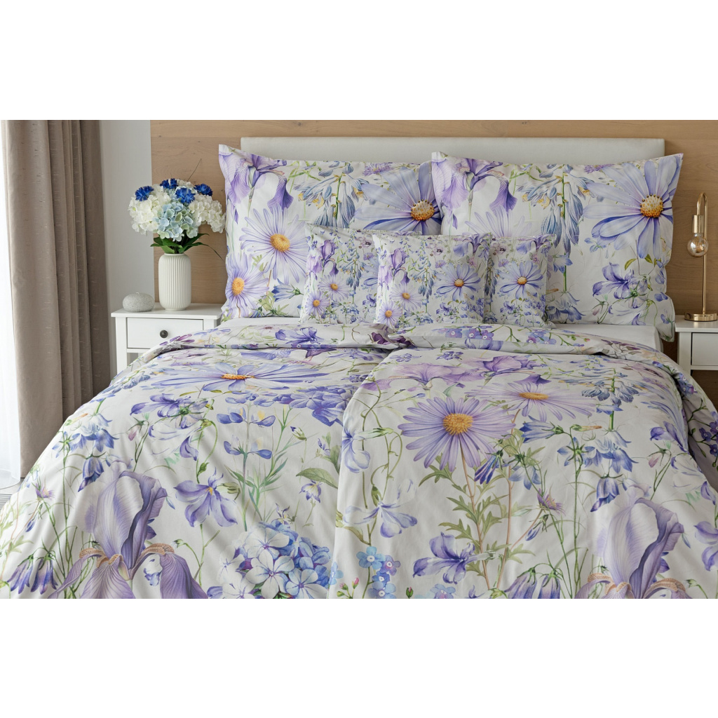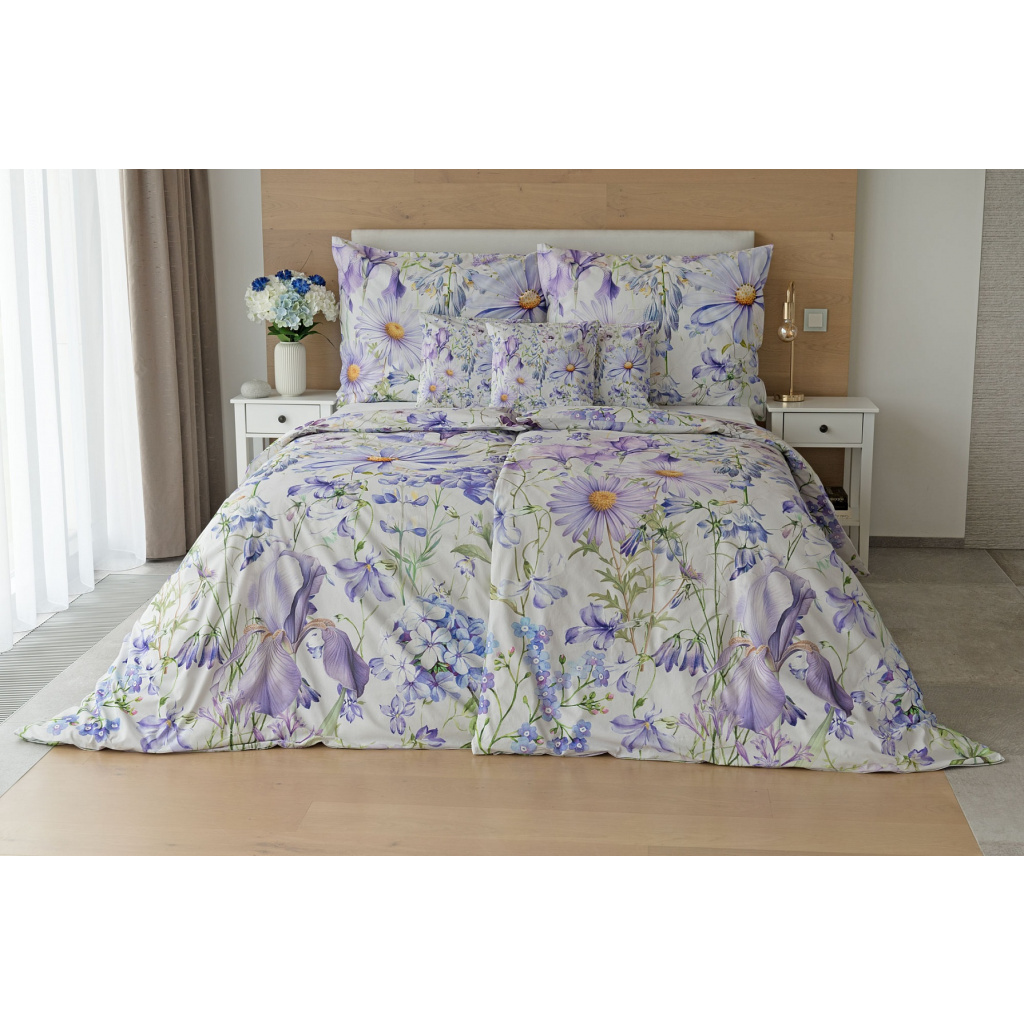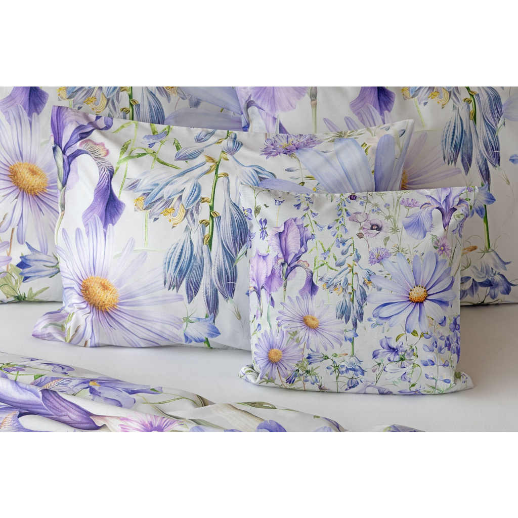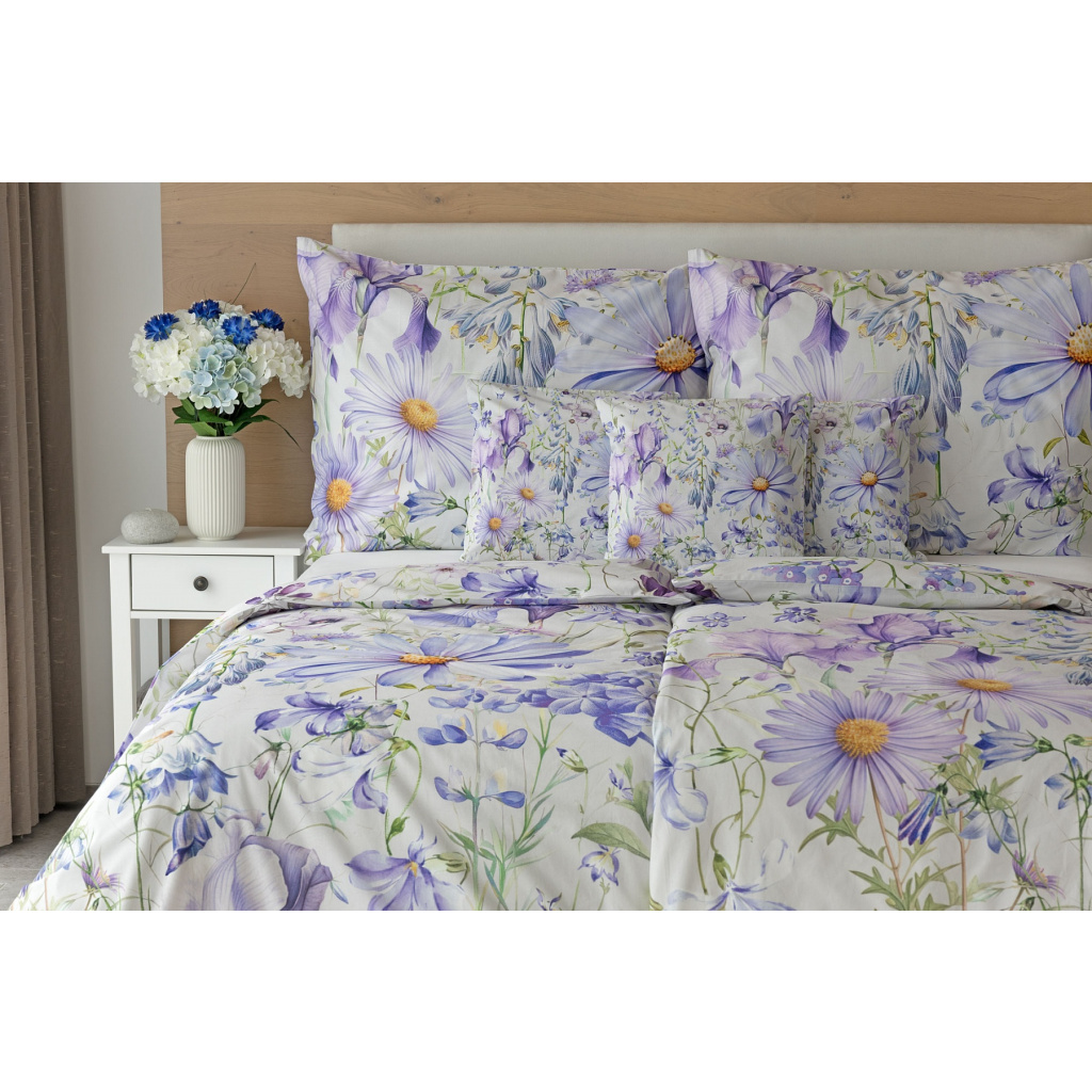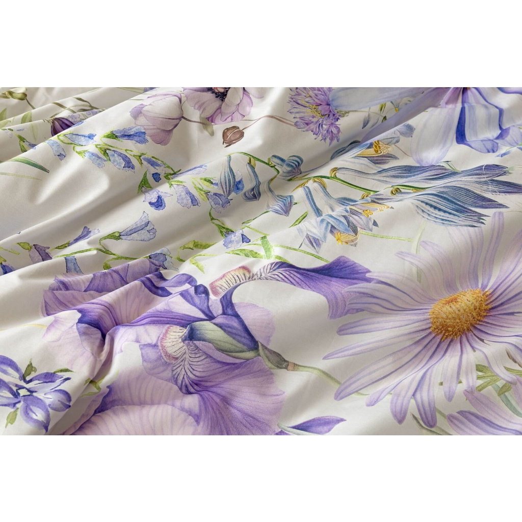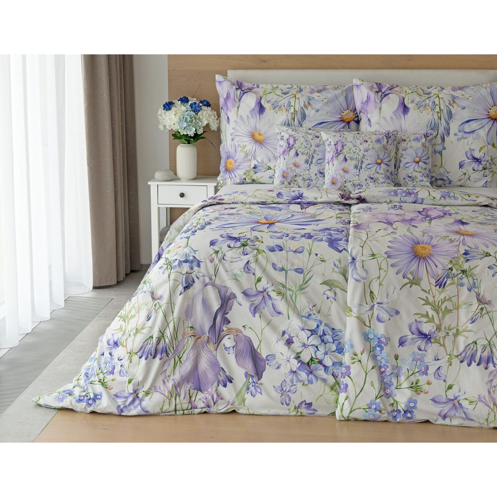 Okouzlující květinové povlečení Mirabel vnese do vaší ložnice nádech svěžesti. Květy kosatců, lučních zvonků, pomněnek i kopretin jsou v návrhu sladěny do atraktivní palety fialových a světle modrých tónů, které působí uklidňujícím a hřejivým dojmem. Díky nejmodernějšímu digitálnímu tisku vyniká florální motiv v precizním detailu.